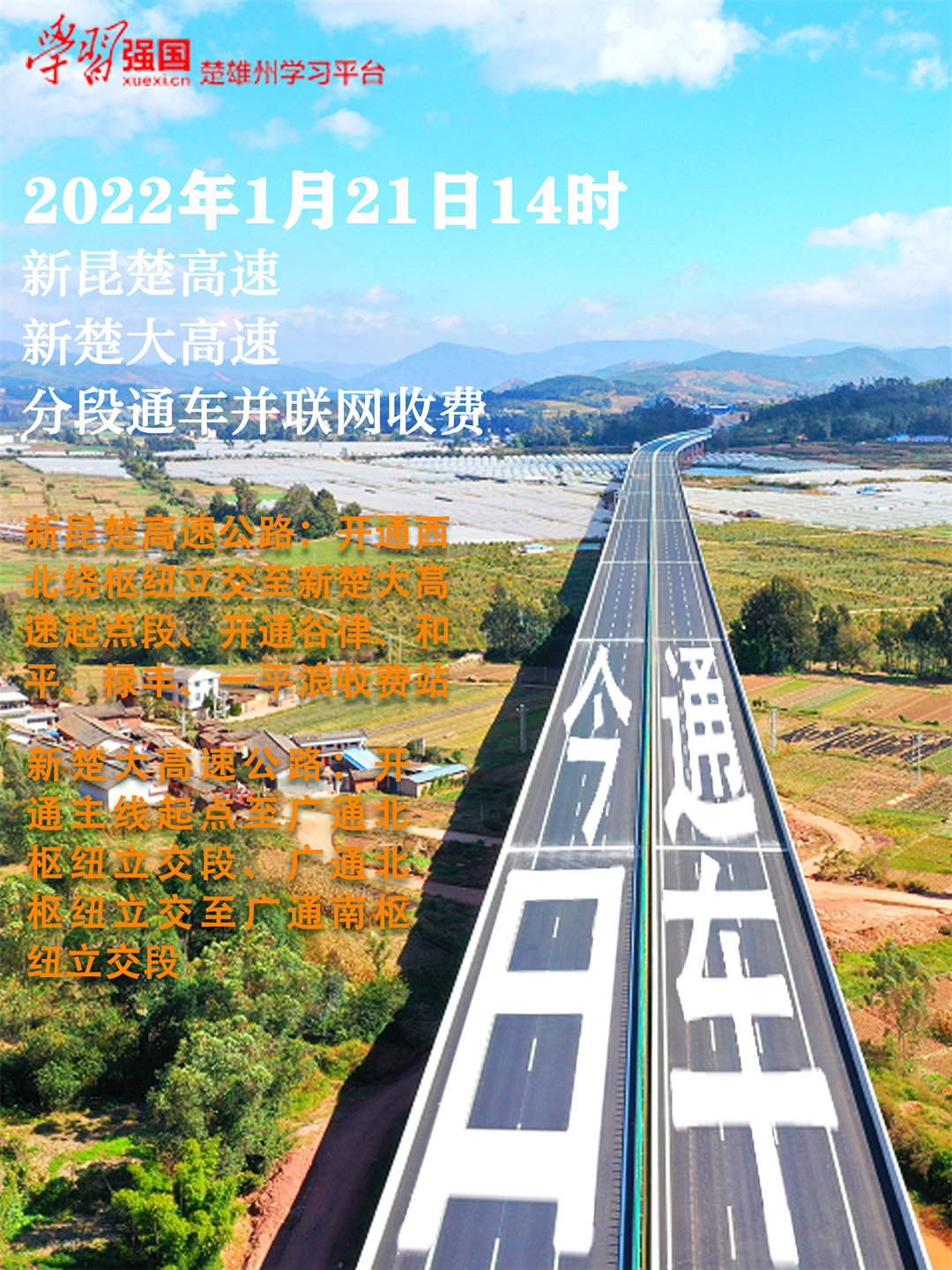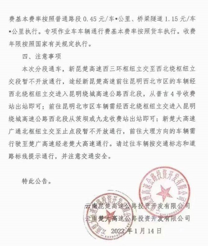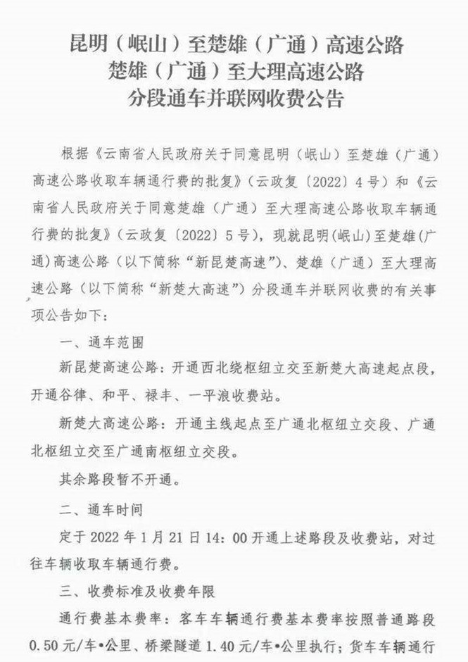 新昆楚、新楚大高速公路分段通车并联网收费公告